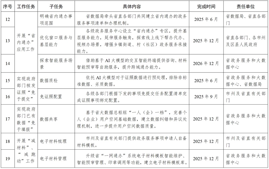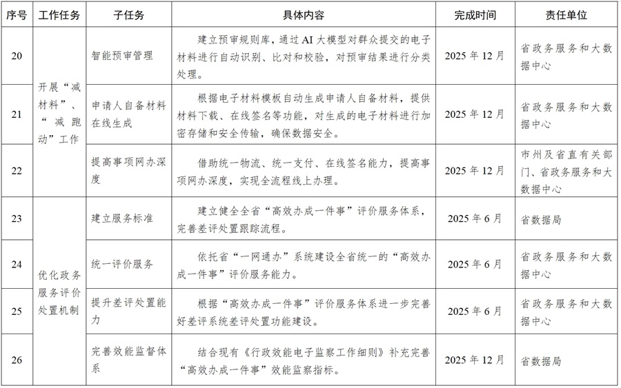 2025年底前,按照“應(yīng)對接盡對接”原則,實現(xiàn)全省依申請類政務(wù)服務(wù)事項與省“一網(wǎng)通辦”系統(tǒng)的對接率和上線率均達(dá)到100%,政務(wù)中心設(shè)備與省“一網(wǎng)通辦”系統(tǒng)全面對接;基于AI大模型對省政務(wù)服務(wù)網(wǎng)進(jìn)行智能化改版升級;推進(jìn)電子證照“免提交”、表單信息“免填寫”、電子簽名“減材料”、物流支付“減跑動”等工作,促進(jìn)數(shù)字政務(wù)建設(shè)取得明顯成效。