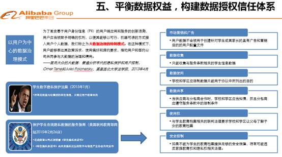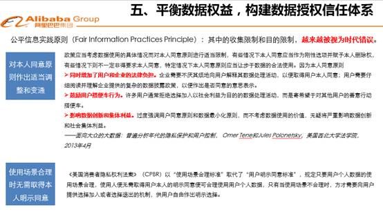 第五個問題就是數(shù)據(jù)權(quán)益。數(shù)據(jù)流動過程中涉及到的主體很多,每個主體有不同的角色,擔(dān)當(dāng)各種的職能,有各種各樣的權(quán)益,這個權(quán)益是動態(tài)架構(gòu),不是一個靜態(tài)的固定模式。如何在這個動態(tài)架構(gòu)下,對相關(guān)主體的權(quán)益進(jìn)行合理分配、界定,這是當(dāng)前一個比較緊迫的問題。美國學(xué)界當(dāng)前正在討論利益平衡機(jī)制原則等數(shù)據(jù)權(quán)益分配原則,在此展現(xiàn)出來,看看能否對我們會有一些啟發(fā)和思考。美國還強調(diào)以用戶為中心的數(shù)據(jù)治理模式,有學(xué)者提出應(yīng)對OECD數(shù)據(jù)保護(hù)八大原則進(jìn)行適當(dāng)調(diào)整和改進(jìn),部分觀點直指本人同意原則,認(rèn)為這個原則嚴(yán)重過時,限制了大數(shù)據(jù)時代的數(shù)據(jù)利用需求,應(yīng)當(dāng)進(jìn)行大的調(diào)整;部分觀點主張要用使用場景合理原則來替代用戶同意原則。網(wǎng)安法才剛剛實施,網(wǎng)安法規(guī)定的許多重大原則卻面臨著更新和淘汰,充分說明數(shù)據(jù)發(fā)展無止境,數(shù)據(jù)立法也不會有終點。