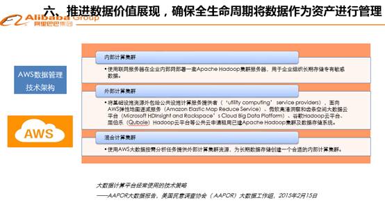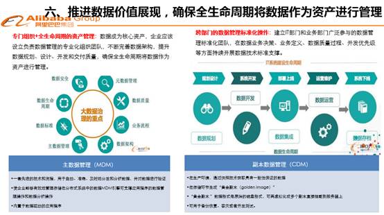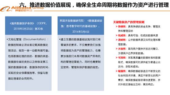 第六個方面,供大家思考的問題是數(shù)據(jù)管理。因為數(shù)據(jù)有價,所以要進(jìn)行管理。世界各國,特別是美國很早提出來對數(shù)據(jù)全生命周期按照資產(chǎn)進(jìn)行管理。這個理念很先進(jìn),在今天互聯(lián)網(wǎng)時代也很合適,行業(yè)、企業(yè)和政府機(jī)構(gòu),擁有數(shù)據(jù)庫的,是不是應(yīng)當(dāng)肩負(fù)使命,把數(shù)據(jù)作為資產(chǎn)在全生命周期管理起來。甚至有一些比較激進(jìn)的學(xué)者提出將數(shù)據(jù)納入資產(chǎn)負(fù)債表來進(jìn)行管理,這種觀念同時提出數(shù)據(jù)會計計賬模型、數(shù)據(jù)會計準(zhǔn)則等可操作的方法和模型。這種做法和秉承的理念,也對我們是有啟發(fā)意義的,至少能夠說明數(shù)據(jù)是有價值的,至于采取會計方式還是采取其它非會計方式來進(jìn)行管理,這都可以討論。
