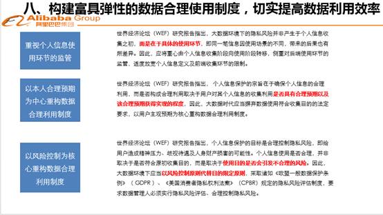 第七個方面,我想給大家討論一下數(shù)據(jù)的使用許可機(jī)制,要打造可信的數(shù)據(jù)流通渠道。數(shù)據(jù)如果不被許可,數(shù)據(jù)無法進(jìn)行流通。數(shù)據(jù)在使用之前,一定取得數(shù)據(jù)控制人的使用許可。在這個使用許可上在這個框架里有設(shè)定,現(xiàn)在有法律安排、合同安排,互聯(lián)網(wǎng)企業(yè),往往會在一個類似于信息政策,對其用戶做出一種用戶本人同意的法律安排。這個安排一旦點進(jìn)了一個按鈕,我就認(rèn)為,你對我已經(jīng)授權(quán)了,我可以使用你的數(shù)據(jù)。所有這些安排,是不是可信,或者靈活動態(tài),都需要進(jìn)行討論,有些授權(quán)機(jī)制,本身可能具有壟斷、濫用的嫌疑。數(shù)據(jù)必須進(jìn)行流通,如果不流通不能價值,不能追加更新,就變成動態(tài)數(shù)據(jù)。為了變成動態(tài)數(shù)據(jù),在架構(gòu)里面流通,架構(gòu)就是數(shù)據(jù)架構(gòu)或者互聯(lián)網(wǎng),要進(jìn)行數(shù)據(jù)流通,基礎(chǔ)設(shè)施配套,它的價值才能被體現(xiàn)。