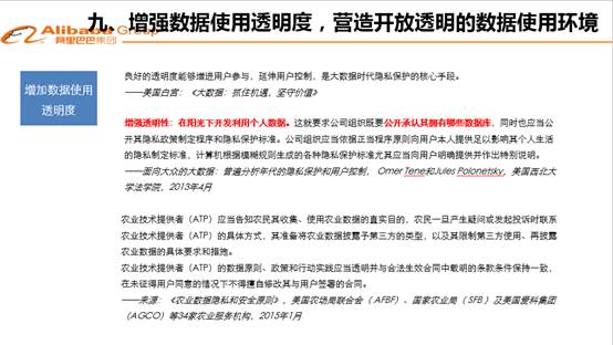 第九個方面,數(shù)據(jù)使用透明度問題。第九個方面,建議增強數(shù)據(jù)使用透明度,營造開放透明的數(shù)據(jù)使用環(huán)境。企業(yè)要通過各種政策宣示和實際行動,增強其數(shù)據(jù)使用的透明度,增加用戶對自己數(shù)據(jù)控制方的信任度。