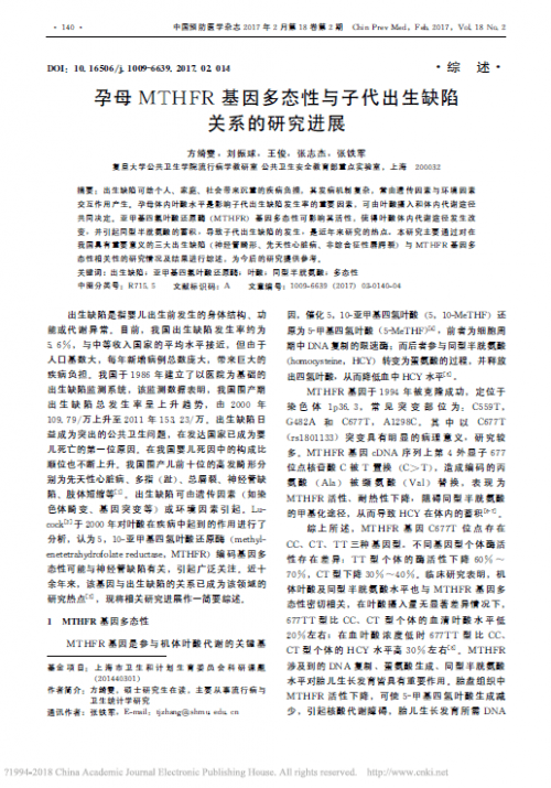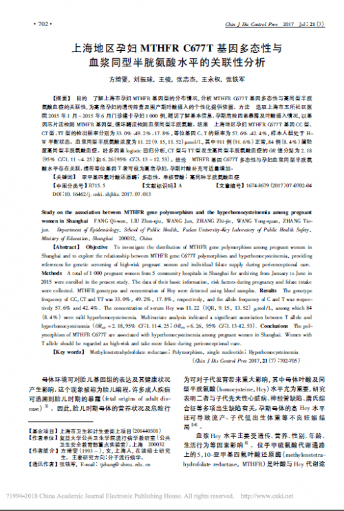 該研究項目成果論文——《上海地區(qū)孕婦MTHFR C677T基因多態(tài)性與血漿同型半胱氨酸水平的關(guān)聯(lián)性分析》已收錄于《中華疾病控制雜志2017年7月第21卷第7期》、論文——《孕母MTHFR基因多態(tài)性與子代出生缺陷關(guān)系的研究進展》收錄于《中國預(yù)防醫(yī)學雜志2017年2月第18卷第2期》。